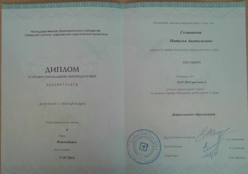В 2014 году прошла профессиональную переподготовку в Негосударственном образовательном учреждении Сибирского института современной практической психологии по специальности "Дошкольное образование"