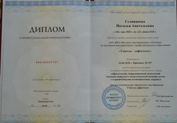 В 2020 году прошла профессиональную переподготовку в Автономной некоммерческой организации дополнительного профессионального образования "Институт дистанционного обучения" по программе "Учитель - дефектолог"